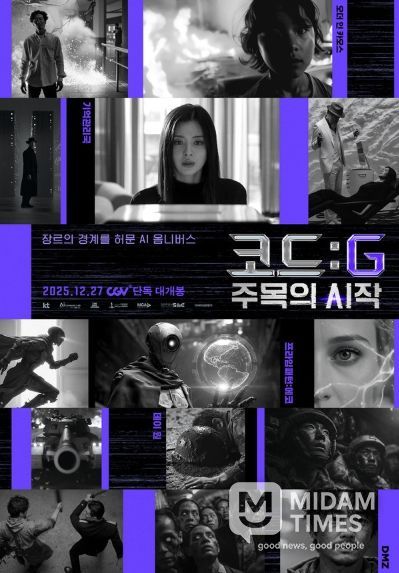 미담타임스 김교환 기자 | 생성형 AI 유니버스의 서막을 여는 영화 '코드: G 주목의 시작'이 12월 27일 개봉을 확정하고, 다섯 가지 매력을 담아낸 포스터를 전격 공개했다.[감독 : 김주신, 김영기, 권한슬/홍기선, 송영윤, 김광식 | 제작: MBC C&I/ 디 에이프 스쿼드/ 스튜디오프리윌루전/ MCA | 공동기획/투자 : KT | 배급 : KT스튜디오지니, 영화특별시SMC]