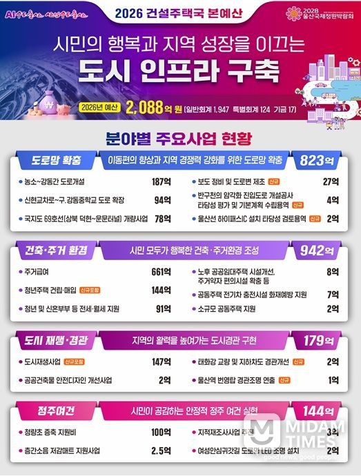 이를 위해 울산시는 내년도 건설·주택 분야 예산을 총 2,088억 원 규모로 편성했다.