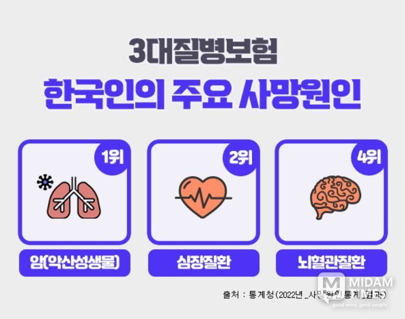 미담타임스 김준완 기자 | 흔히 3대질병이라 일컫는 암, 심혈관질환, 뇌혈관질환은 통계청 발표자료에 따르면 한국인의 주요 사망원인 중에서 3위 폐렴을 제외하고 1~4위를 차지하고 있으며, 이전부터 지금까지도 살면서 가장 먼저 대비해야 하는 치명적인 질병으로 강조되고 있다. 이러한 중대질병에 대비하기 위하여 상기 세가지 치명적인 질병을 집중보장하는 3대질병진단비보험을 많이 가입하고 있다. 3대진단비보험은 각각의 질병을 중점적으로 보장하면서도 가입자 특성에 맞는 특약을 추가함으로써 종합건강보험으로도 활용할 수가 있다.