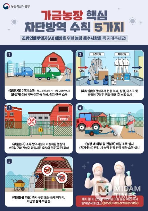 농식품부는 바이러스 접촉 가능성이 있는 철새도래지 등 출입을 삼가고, 전국의 가금 농장에서 출입 차량 소독, 축사 출입 전 전용 장화 갈아신기, 기계·장비 등을 축사 내 반입 시 세척 및 소독조치 등 기본적인 방역수칙을 철저히 준수해 줄 것을 강조했다.