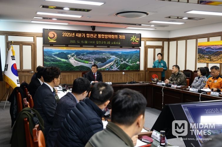 미담타임스 김교환 기자 | 경남 합천군은 15일 합천군청 2층 소회의실에서 의장을 포함한 통합방위협의회 위원 및 간사 19명이 참석한 가운데, 2025년 4분기 통합방위협의회 회의를 개최하여 2025년 통합방위 주요 사항을 점검하고 2026년 효과적인 통합방위를 위한 기관 간 협력체계 강화 방안을 논의했다.