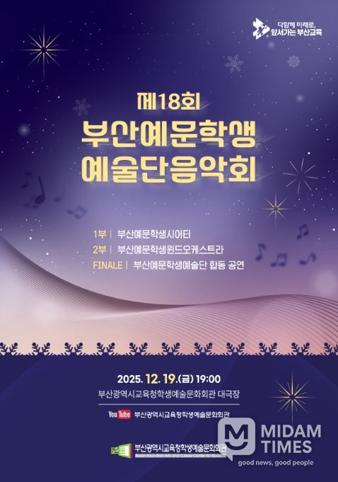 미담타임스 김교환 기자 | 부산광역시교육청 학생예술문화회관은 19일 오후 7시 회관 대극장에서 ‘제18회 부산예문학생예술단음악회’를 개최한다.