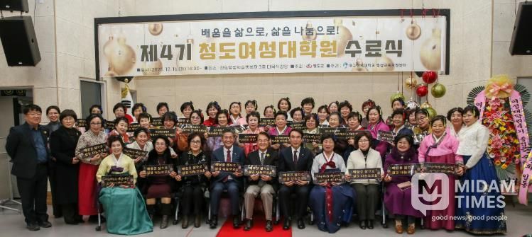 미담타임스 김준완 기자 | 청도군은 지난 16일 청도평생학습행복관 3층 다목적강당에서 수료생 및 관계자 60여명이 참석한 가운데 “제4기청도여성대학원 수료식”을 개최했다.
