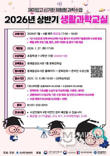 미담타임스 김교환 기자 | 부산 동래구는 2026년 1월부터 동래읍성도서관과 안락누리도서관, 온빛어린이 작은도서관에서 부산과학기술협의회와 연계해 관내 초등학생을 대상으로 ‘생활과학교실'을 운영한다고 밝혔다.