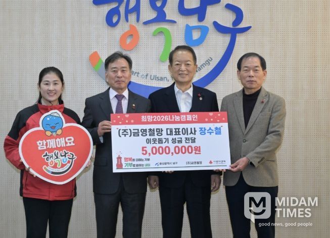 미담타임스 김준완 기자 | 울산 남구는 17일 ㈜금영철망 장수철 대표이사가 남구청을 방문해 연말을 맞아 이웃돕기 성금 500만 원을 울산사회복지공동모금회에 지정 기탁했다.