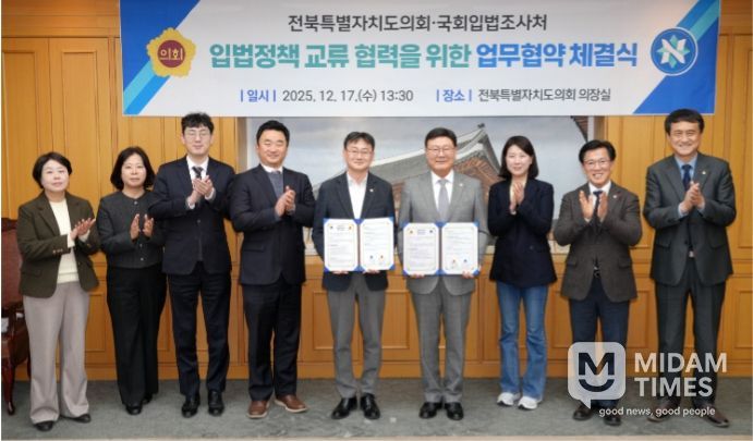 미담타임스 정인화 기자 | 전북특별자치도의회는 17일 국회입법조사처와 입법정책 분야의 상호 교류 및 협력을 위한 업무협약(MOU)을 체결했다.