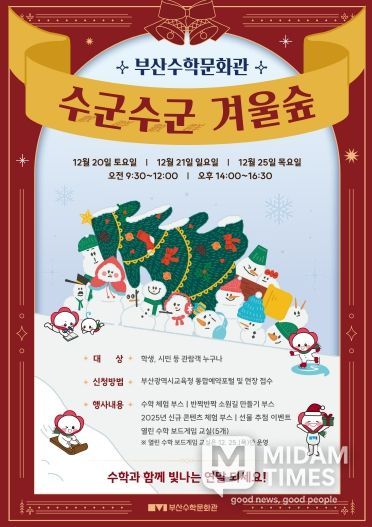 미담타임스 김교환 기자 | 부산광역시교육청창의융합교육원(원장 한종환)은 오는 20일, 21일, 25일 3일간 부산수학문화관에서 학생과 시민 3,000여 명을 대상으로 ‘수군수군(數群數群) 겨울숲’ 행사를 개최한다.