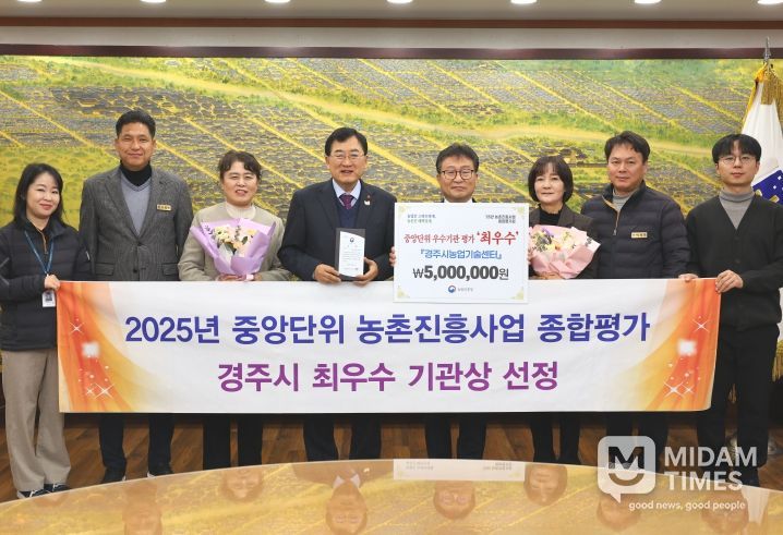 미담타임스 김준완 기자 | 경주시는 농촌진흥사업 전반에서의 우수한 성과를 인정받아 지난 4일 농촌진흥청에서 열린 '2025년 농업과학기술 성과공유대회'에서 농촌진흥사업 종합평가 ‘최우수상’을 수상했다고 밝혔다.