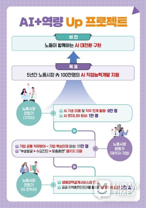 새로운 도전을 준비하는 중장년 등 이·전직 준비자에게는 공공직업교육훈련기관인 폴리텍을 통해 AI 기초활용교육(2.8만명)뿐만 아니라 전문 AX 훈련(1천명)을 제공하고, 지역을 중심으로 AI를 활용한 직무 전환 훈련도 새롭게 지원할 예정이다.