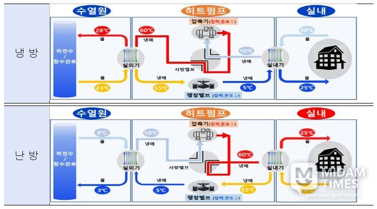 물의 온도는 여름에는 대기 온도보다 낮고, 겨울철에는 높은 특성을 지니고 있다. 수열에너지는 이러한 물의 특성을 이용해 냉‧난방에 활용하는 재생에너지원으로, 냉각탑‧실외기를 생략할 수 있으며, 기존 상수도관을 열원으로 활용해 별도의 송전선로 설치 없이 빠르게 공급할 수 있는 장점이 있는 것으로 알려져 있다.