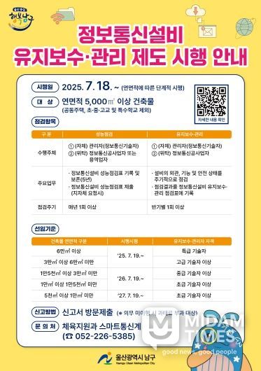 미담타임스 김준완 기자 | 울산 남구는 연면적 5,000㎡ 이상 건축물의 정보통신설비 유지보수‧관리자 선임을 의무화하는 ‘정보통신설비 유지보수‧관리 제도’를 지난 7월 19일부터 시행하고 있다고 밝혔다.