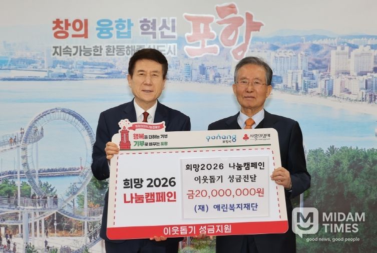 이강덕 포항시장은 “희망2026 나눔캠페인 기간 중 뜻깊은 나눔을 실천해 주신 애린복지재단에 깊이 감사드린다”며 “전달받은 성금은 도움이 절실한 이웃들에게 소중히 전달될 수 있도록 하겠다”고 말했다.