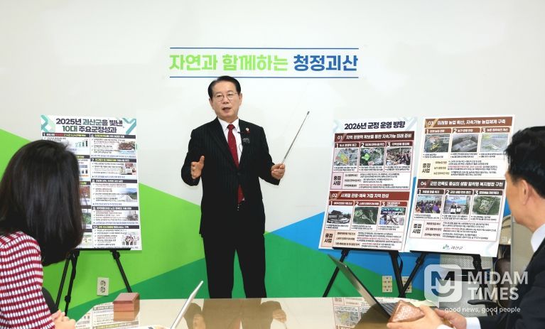 송인헌 괴산군수는 22일 군청 브리핑룸에서 민선 8기 한 해의 주요 성과와 2026년 군정 운영 방향을 발표하며, “중앙부처와 국회를 수십 차례 오가며 발품 행정을 펼친 결과, 연이은 대규모 정부사업 선정으로 외부 재원을 확보해 재정 건전성을 높이고 지역 발전 전략의 추진력을 마련했다”고 밝혔다.
