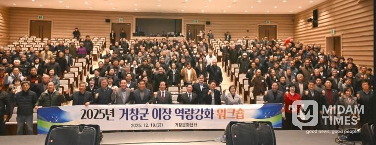 미담타임스 김교환 기자 | 거창군은 지난 19일 거창문화센터 공연장에서 구인모 군수, 신성범 국회의원, 이재운 군의회 의장, 박주언 문화복지위원장, 김일수 도의원, 군의원, 거창군 이장, 담당 공무원 등 300여 명이 참석한 가운데 ‘2025년 거창군 이장 역량강화 워크숍’을 성황리에 개최했다고 밝혔다.