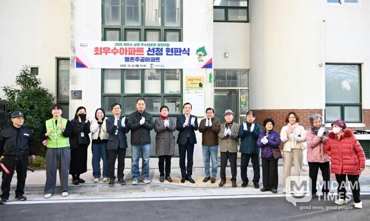 미담타임스 김준완 기자 | 울산 북구는 22일 2025년 저탄소 실천 우수아파트 경진대회에서 최우수아파트로 선정된 명촌주공아파트에서 현판식을 열었다.