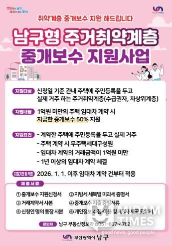 미담타임스 김교환 기자 | 부산 남구는 관내 거주하는 주거 취약계층의 경제적 부담을 완화하고 안정적인 주거환경을 조성을 위해 오는 2026년 1월부터 ‘주거 취약계층 중개보수 지원사업’을 시행한다고 밝혔다.