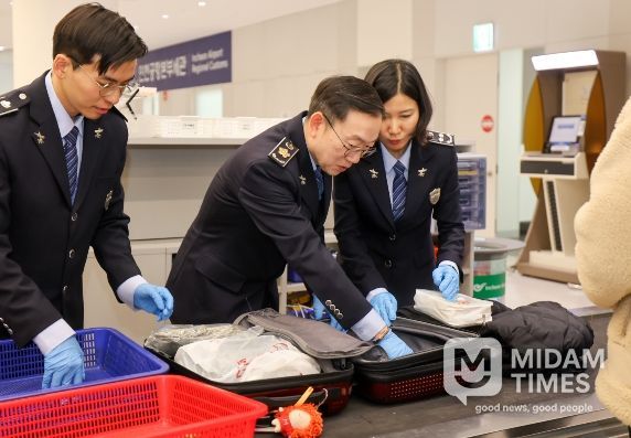 미담타임스 김교환 기자 | 관세청은 22일 이명구 관세청장이 인천공항을 찾아, 여행자 휴대품 검사관들과 함께 우범 수하물 선별 및 개장검사, 우범여행자 신체 및 밀리미터파 검색기 운용 등 마약 검사업무를 직접 수행하며 여행자 분야 마약 단속 현장을 점검하고, 지난 5일 발표한 ‘관세청 마약 단속 종합 대책’의 철저한 이행을 주문했다고 밝혔다.