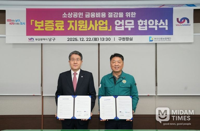 미담타임스 김교환 기자 | 부산 남구는 부산신용보증재단(이사장 성동화)과 지난 12월 22일 남구청에서 소상공인 경영 안정과 민생경제 활성화를 위한 '남구 소상공인 보증료 지원사업 업무협약'을 체결했다고 밝혔다.
