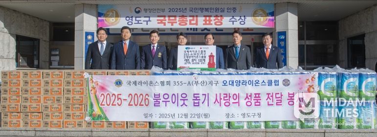 미담타임스 김교환 기자 | 국제라이온스협회 355-A지구 제4지역 오대양 라이온스클럽(회장 이문근)은 지난 12월 22일 회원들과 함께 영도구를 방문하여 이웃돕기 성품으로 라면 100박스와 휴지 100팩(300만 원 상당)을 기탁하며 지역사회에 따뜻함을 더했다.