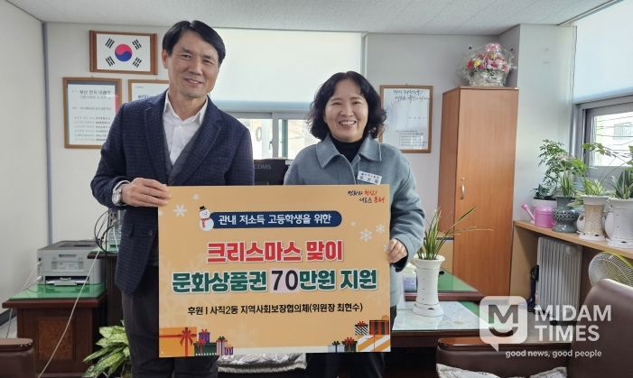 미담타임스 김교환 기자 | 부산 동래구 사직2동 행정복지센터는 지난 18일 사직2동 지역사회보장협의체(위원장 최현수)로부터 크리스마스를 맞아 70만 원 상당의 문화상품권을 전달받았다고 밝혔다.