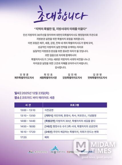 미담타임스 정인화 기자 | 강원특별자치도는 12월 23일 코트야드 바이 메리어트 세종에서 강원, 제주, 세종, 전북 4개 특별자치시도지사들이 모여 대한민국특별자치시도 행정협의회 두 번째 정기회의를 개최했다.
