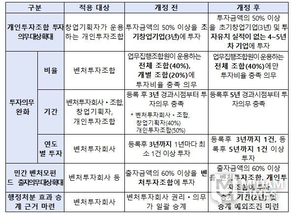 이를 통해 시장 상황을 반영하여 보다 유연한 투자 전략 수립이 가능해질 전망이다. 특히 초기투자 생태계의 주축을 이루는 개인투자조합과 창업 기획자의 활동 반경이 한층 넓어질 것으로 기대된다.