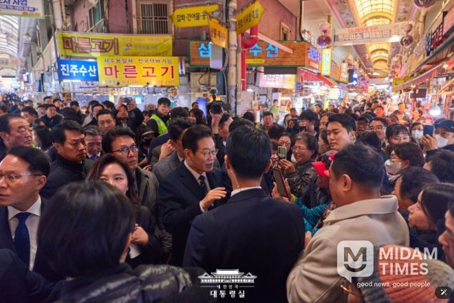 이 대통령은 환영 인파 가운데 나이가 지긋한 어르신들과 할머니들을 지나치지 않으며 “춥지 않으시냐, 장 보러 나오셨냐?”며 따뜻한 인사를 건넸다.