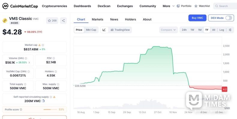 출금정지처분의 결정적 요인은 자체 발행한 VMC 코인이 불법매도된 사건이다. 2025년7월에 최초 미국 거래소인 Bitmart 에 상장한 VMC 는 상장가 $10을 시작으로 높은 상장 시작가임에도 불구하고 2개월만에 $600 대를 돌파했다. 사건이 터지기 11월4일 전까지는 $2,400 까지 넘어서는 놀라운 기록을 보였지만 결국 불법매도가 시작된 LBank 가 빅토리아 거래소를 금융당국에 신고하면서 현재는 상장가 미만으로 가격이 폭락하게 되는 희대의 사건으로 전락하고 말았다.