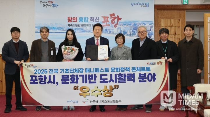 미담타임스 김준완 기자 | 포항시가 지난 22일부터 23일까지 양일간 상지대학교에서 열린 ‘제1회 2025 전국 기초단체장 매니페스토 문화정책 콘체르토’에서 문화기반 도시활력 분야 우수상을 수상했다.