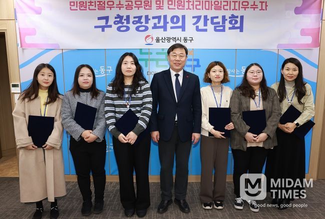 미담타임스 김준완 기자 | 울산 동구는 12월 24일 오전 9시 구청장실에서 친절 우수 공무원 등 민원 담당 공무원 6명이 참석한 가운데, ‘하반기 친절 우수 공무원 격려’ 및 ‘구청장과 민원 담당 공무원과의 간담회’를 개최했다.