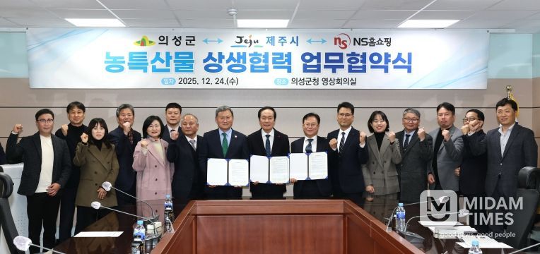 미담타임스 김준완 기자 | 의성군은 지난 24일 제주시 및 ㈜NS쇼핑(대표이사 조항목)과 우수 농특산물 유통 확대와 판로 다각화를 위한 상생협력 업무협약을 체결했다고 밝혔다.