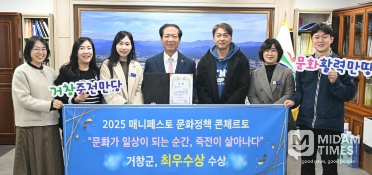 미담타임스 김교환 기자 | 거창군은 강원특별자치도 원주시 상지대학교에서 개최한 ‘2025 전국 기초단체장 매니페스토 문화정책 콘체르토(Concerto)’ 대회에서 문화기반 도시활력분야 ‘최우수상’을 수상했다고 26일 밝혔다.