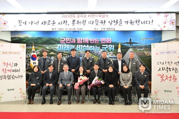 미담타임스 김준완 기자 | 군위군은 26일 군청 대회의실에서 2025년 하반기 퇴임식을 개최하고 오랜기간 군정 발전을 위해 헌신해 온 퇴직 공무원의 노고를 되새기며 감사의 마음을 나누는 시간을 가졌다. 이 날 행사에는 김진열 군수를 비롯하여 퇴직 공무원 2명과 가족, 동료 공직자 등 100여명이 참석한 가운데, 공직자로서의 여정을 되돌아보고 감사의 마음을 전하는 뜻깊은 시간이 마련됐다.(사진)