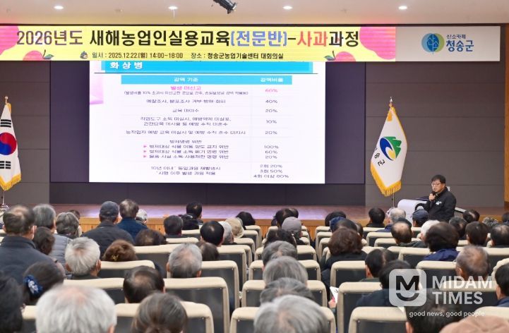 미담타임스 김준완 기자 | 청송군은 지난 22일부터 24일까지 3일간 청송군농업기술센터 대회의실에서 실시한 ‘2026년도 새해농업인 실용교육(전문반)’을 성황리에 마무리했다고 밝혔다.