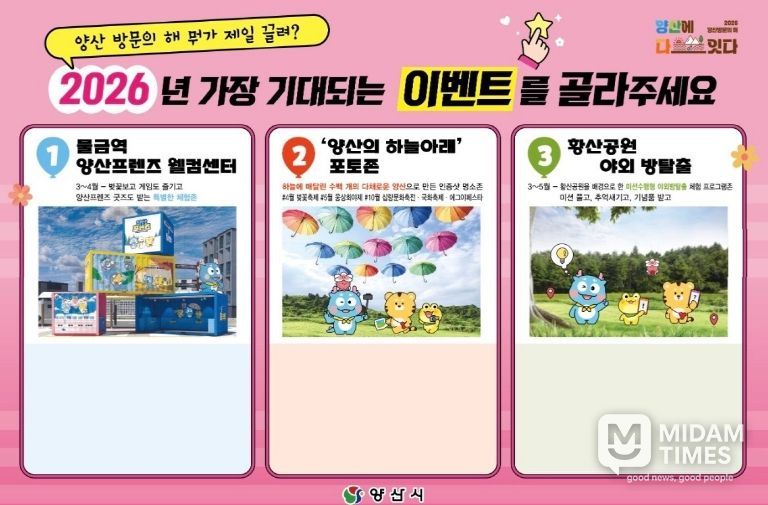 양산시 관계자는 “2026 양산방문의 해는 행정이 일방적으로 만드는 관광이 아니라, 시민과 함께 만들어가는 관광도시 프로젝트”라며 “이번 시민 참여 이벤트를 통해 시민들이 기대하는 관광 콘텐츠를 직접 확인하고, 이를 실제 사업으로 구체화해 나가겠다”고 밝혔다.