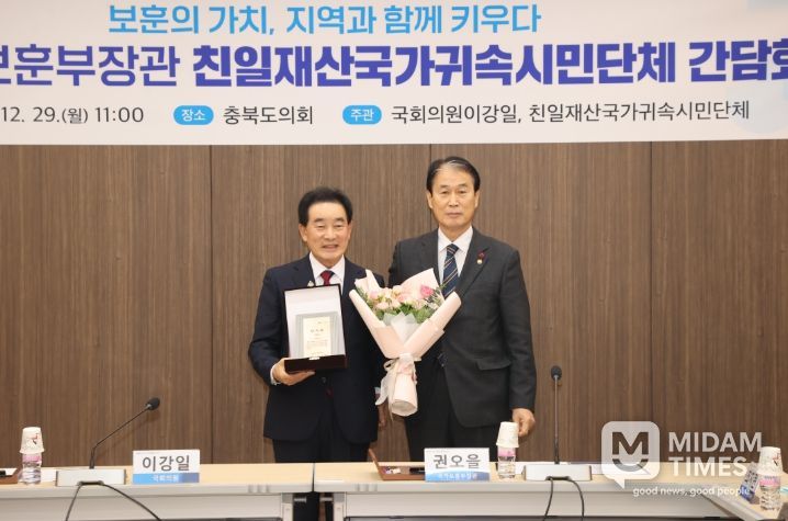미담타임스 정인화 기자 | 충북 진천군은 29일 충북도의회 회의실에서 열린 친일재산 국가귀속 시민단체 현장 간담회에서 권오을 국가보훈부 장관으로부터 국가보훈부 장관 감사패를 수상했다.