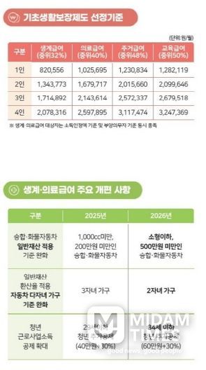 2026년 1인 가구의 중위소득은 2025년 239만 2013원 대비 7.20% 인상된 256만 4238원으로 기초생활보장 수급 가구의 대다수를 차지하는 1인 가구 대상에는 보다 높은 인상률이 적용됐으며, 생계급여 선정기준은 1인 가구 5만 5000원, 4인 가구 12만 7000원 인상돼 생활 수준이 향상될 것으로 기대된다.