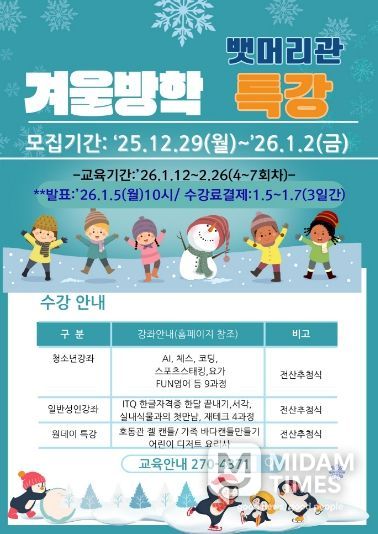 미담타임스 김준완 기자 | 포항시 뱃머리평생교육관은 겨울방학을 맞이한 청소년과 연초 자기계발을 원하는 시민들을 위해 ‘2026년 겨울 특강 프로그램’을 운영한다.