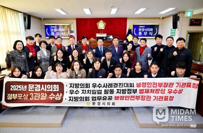 미담타임스 김준완 기자 | 문경시의회는 12월 24일 행정안전부로부터‘2025년도 업무 유공 지방의회’로 선정되어 행정안전부 장관 표창을 수상했다. 이는 경북 도내 23개 지방의회 중 유일하게 문경시의회가 수상했으며, 지방자치제도를 총괄하는 행정안전부가 지방의회의 활동과 실적에 대하여 엄격한 심사를 거쳐 평가한 결과라는 측면에서 매우 뜻깊은 상으로 평가된다.