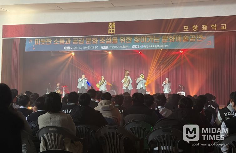 미담타임스 김준완 기자 | 포항교육지원청은 2025년 12월 29일 포항중학교 체육관에서 학생·교직원·학부모 및 Wee센터 상담 인력 등 약 500명을 대상으로 찾아가는 문화예술공연을 개최했다.