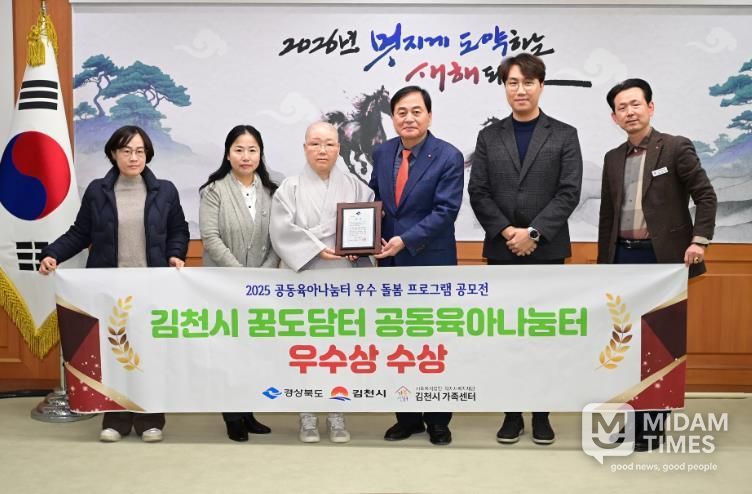 미담타임스 김준완 기자 | 김천시는 ‘2025년 K보듬6000․마을돌봄터․공동육아나눔터 성과공유회’에서 김천시 ‘꿈도담터 공동육아나눔터’가 돌봄 프로그램 우수사례로 선정되어 경상북도지사상을 수상했다고 밝혔다.