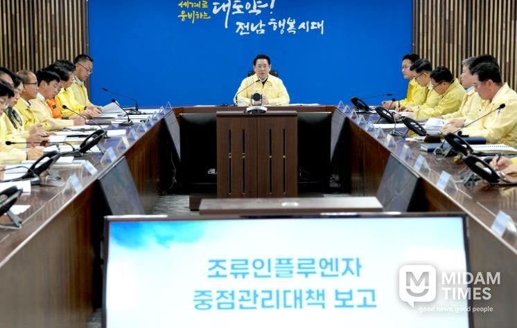 미담타임스 김준완 기자 | 김영록 전라남도지사는 12월 31일 고병원성 조류인플루엔자(AI) 확산 차단을 위한 긴급 재난대책회의를 열어 방역추진 상황을 점검하고, 확산차단에 총력을 다할 것을 당부했다.