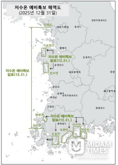 미담타임스 김교환 기자 | 해양수산부는 12월 31일 15시부로 저수온 위기경보* ‘주의’ 단계를 발령했다고 밝혔다.