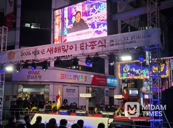 미담타임스 김교환 기자 | 창원특례시는 지난 31일 자정, 마산합포구 불종거리 일원에서 ‘2025년 갈무리 및 2026년 새해맞이 타종식’을 개최하고 시민들과 함께 희망찬 새해의 시작을 알렸다.