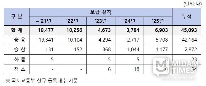 지난해(2025년) 수소차는 전년(2024년)에 비해 182% 늘어난 6,903대가 보급됐다. 특히 수소 승용차는 7년 만에 신차가 출시됨에 따라 전년도 대비 210%가 증가한 5,708대를 기록했다.