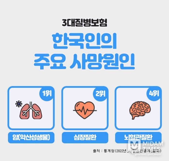 미담타임스 김준완 기자 | 3대질병으로 일컬어지는 암, 뇌혈관질환, 심혈관질환은 한국인의 주요 사망원인에서 상위를 차지하고 있으며, 이에 대한 진단비를 집중적으로 보장해 주는 보험상품을 3대질병진단비 보험이라 할 수 있다.
