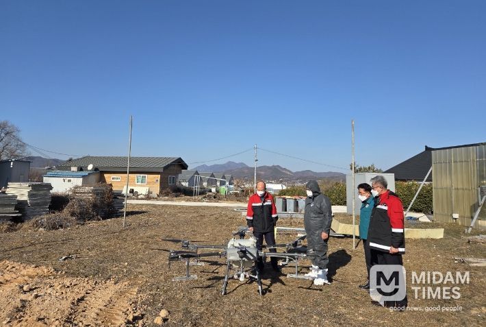 미담타임스 김준완 기자 | 충주시는 7일 고병원성 조류인플루엔자 방생농장 일대에서 드론을 이용해 소독약을 살포하는 방제를 실시했다.