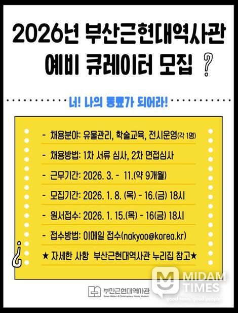 미담타임스 김교환 기자 | 부산근현대역사관은 박물관 학예 분야 전문인력 양성과 청년 일자리 창출을 위해 오늘(8일)부터 1월 16일까지 '2026년 부산근현대역사관 예비 큐레이터(기간제근로자)'를 공개 모집한다고 밝혔다.