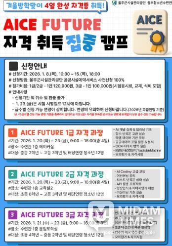 ![[중부청소년수련관] 겨울방학 맞아 AICE FUTURE 자격취득 집중 캠프 운영 홍보지](/data/photos/portnews/202601/20260108154127-55075.jpg)