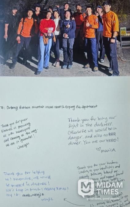 9일 경기도북부소방재난본부에 따르면 지난해 11월 북한산에서 조명 장비 없이 야간 하산을 시도하다 조난을 당한 싱가포르 국적 관광객 4명이 지난달 말 고양소방서에 감사 편지를 보냈다.